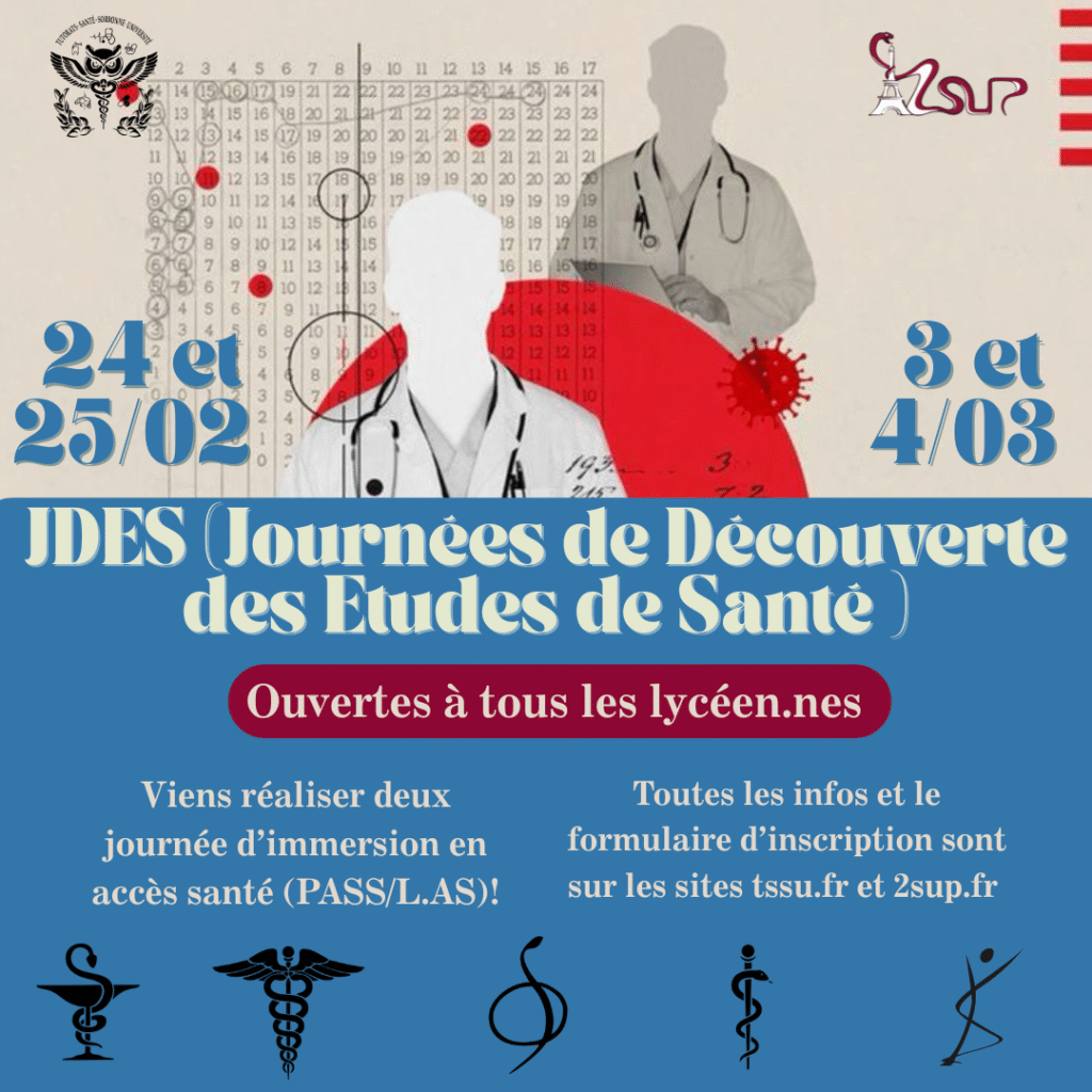 Viens découvrir avec nous les JDES, les Journées Découvertes des Études de Santé Tu rêves de te glisser dans la peau d’un étudiant en PASS/LAS mais tu hésites encore entre quelle fac choisir ? Nous avons la solution pour toi. Pendant deux jours prépare-toi à découvrir les coulisses des études de santé ! Au programme des cours immersifs de biochimie, physiologie, histologie et bien plus pour te mettre dans le quotidien d’un étudiant de première année !