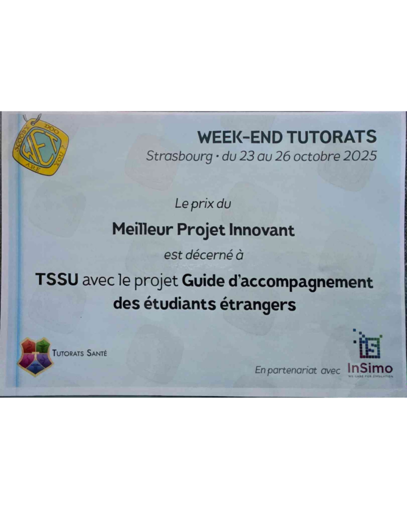 - Le « Prix du Projet Innovant » (lors du Week-End des Tutorats) : Nous avons également été récompensés lors de cet événement national pourla création de notre guide d’accompagnement des étudiants étrangers. Cette initiative souligne notre volonté de faciliter l’intégration et de garantir l’égalité des chances pour les étudiants internationaux arrivant à Sorbonne Université.