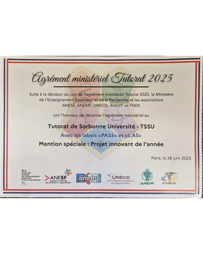 Le Tutorats Santé Sorbonne Université (TSSU) est particulièrement fier d’annoncer le renouvellement de son Agrément ministériel, délivré par le Ministère de l’Enseignement Supérieur et de la Recherche (MESR). Cette distinction est une immense source de fierté pour toutes nos équipes. Elle vient saluer la qualité, le sérieux et l’efficacité des actions que nous menons tout au long de l’année, et atteste que notre structure répond à des standards de qualité.